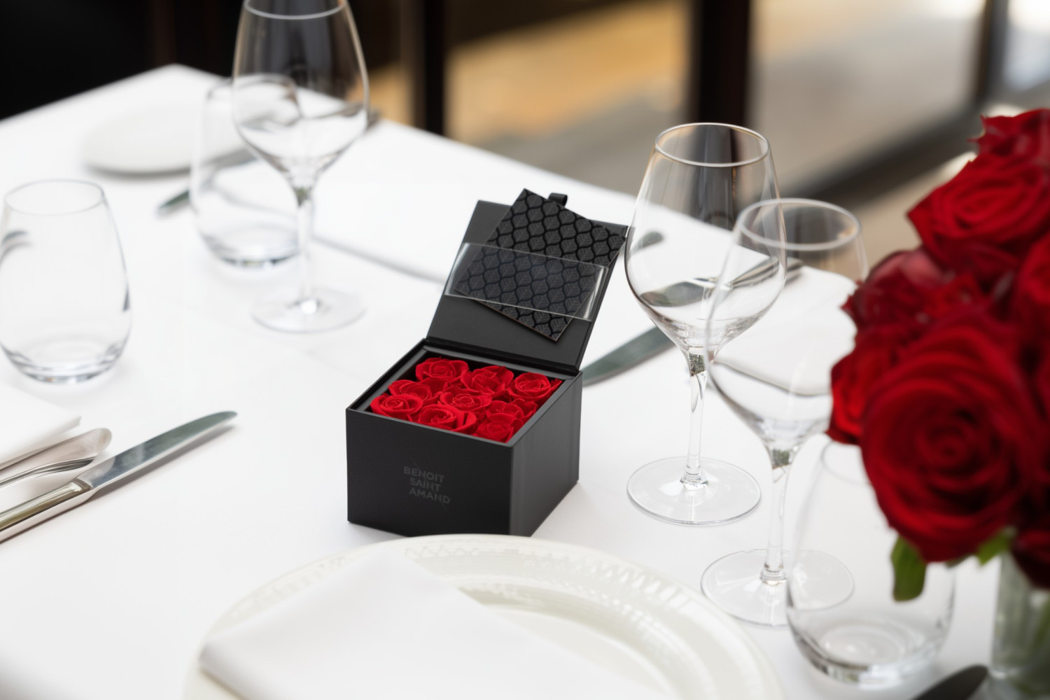 « Un Secret », the Benoît Saint-Amand creation, is now available in a box of 9 roses. These stabilized flowers are delicately scented. Each box is still available with a 2-part message card in the removable lid.