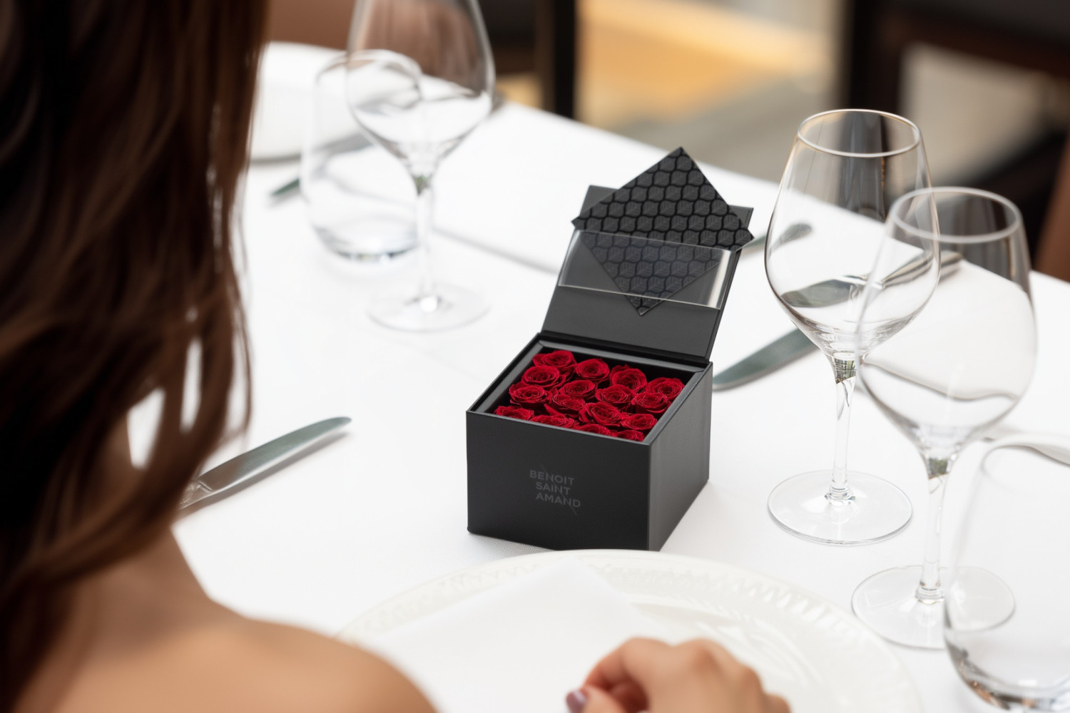 « Un Secret », the Benoît Saint-Amand creation, is now available in a box of 16 roses. In a case with a removable lid, these delicately scented preserved roses elegantly accompany a 2-part message card.
