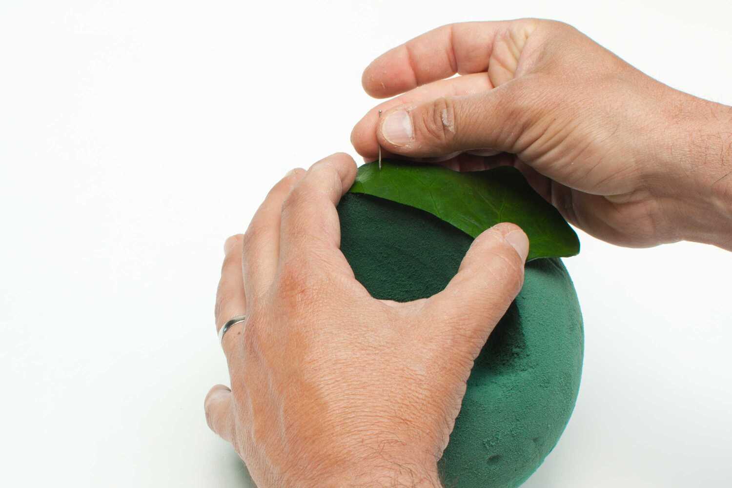TIP: When cutting the ivy leaves in half, cut the center rib so that the leaf fits the foam ball.