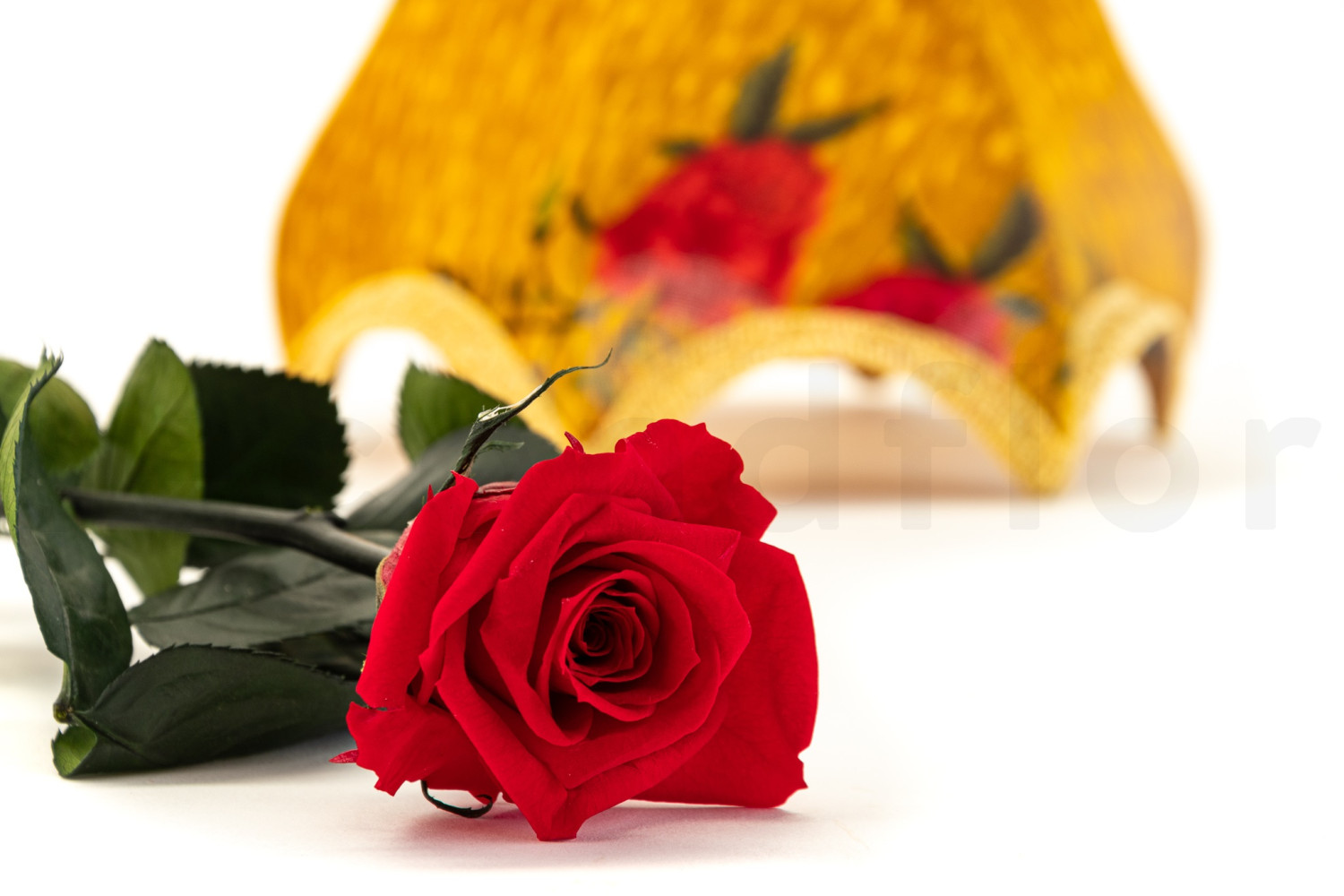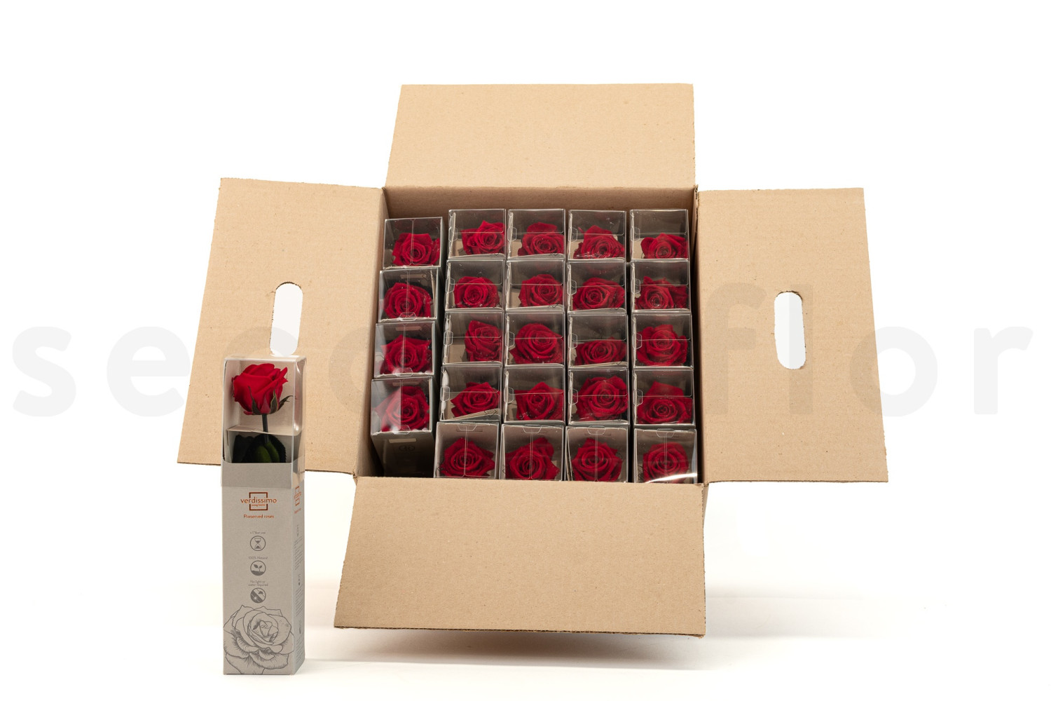 Discover our preserved red rose on stem in a box of 25 individual ready-to-sell boxes.