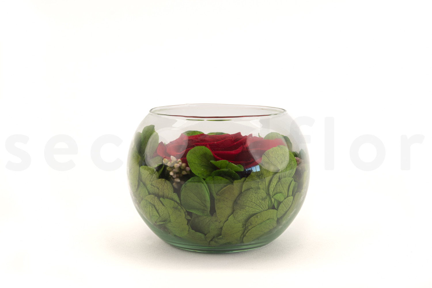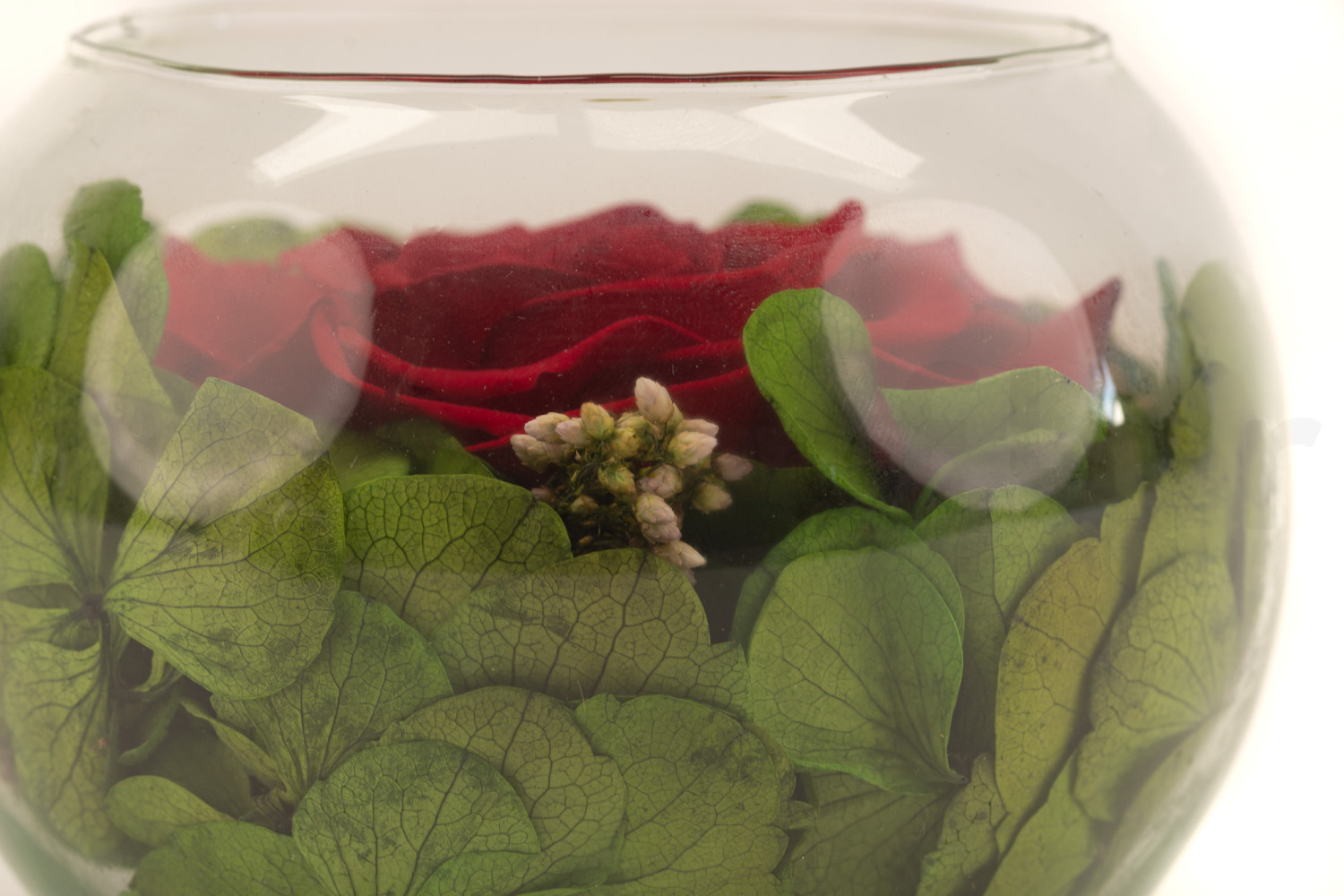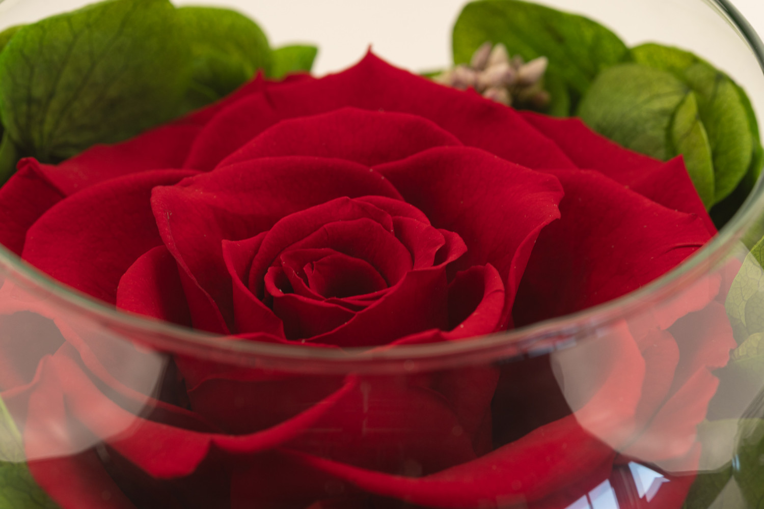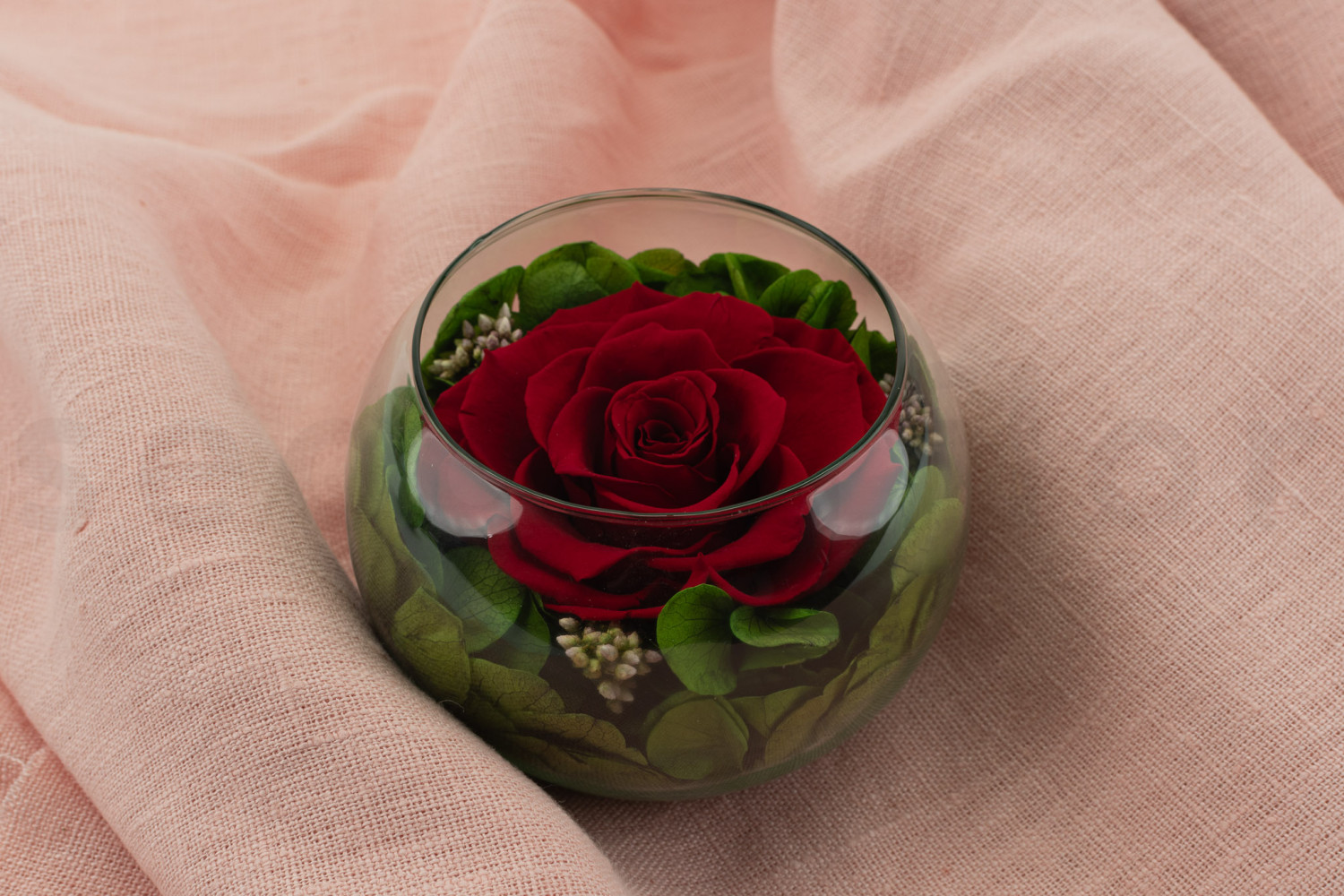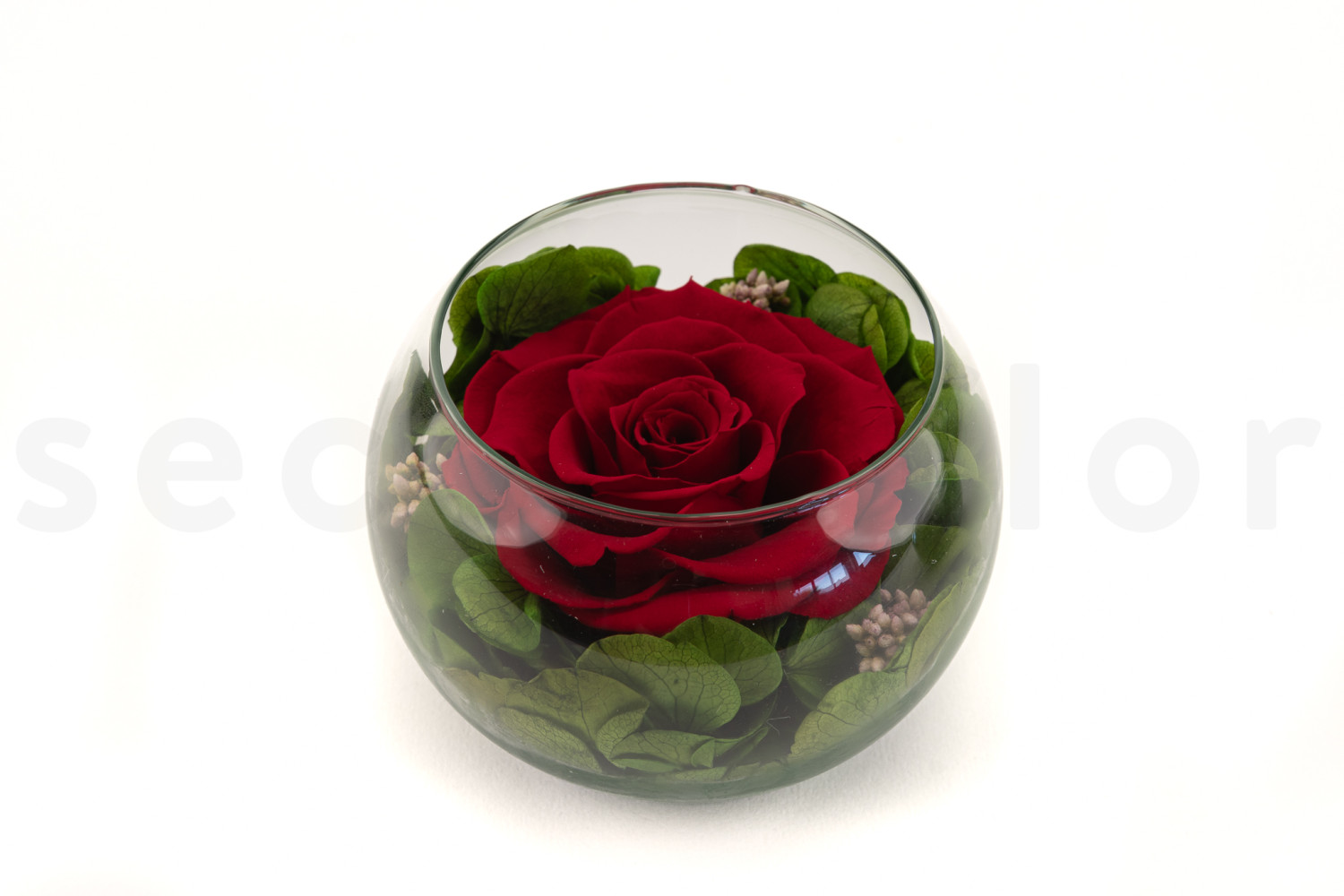 Timeless Elegance: The red rose, symbolizing enduring love, takes center stage in this carefully crafted glass bowl. Its deep, rich color and velvety petals create a visual masterpiece that embodies timeless elegance. Resting on a lush bed of preserved hydrangea, this arrangement is a harmonious blend of textures and colors. The meticulous arrangement showcases the artistry behind each preserved element, providing a stunning visual display.