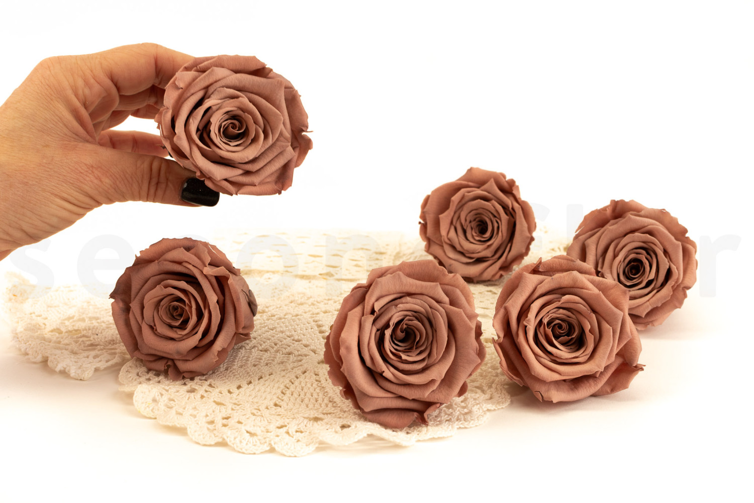 Bring warmth and sophistication to your floral designs with this exquisite set of 6 Roseamor preserved roses in dark brown. Each rose measures 6.5cm in diameter, offering premium quality and timeless beauty that lasts for months without any care required.